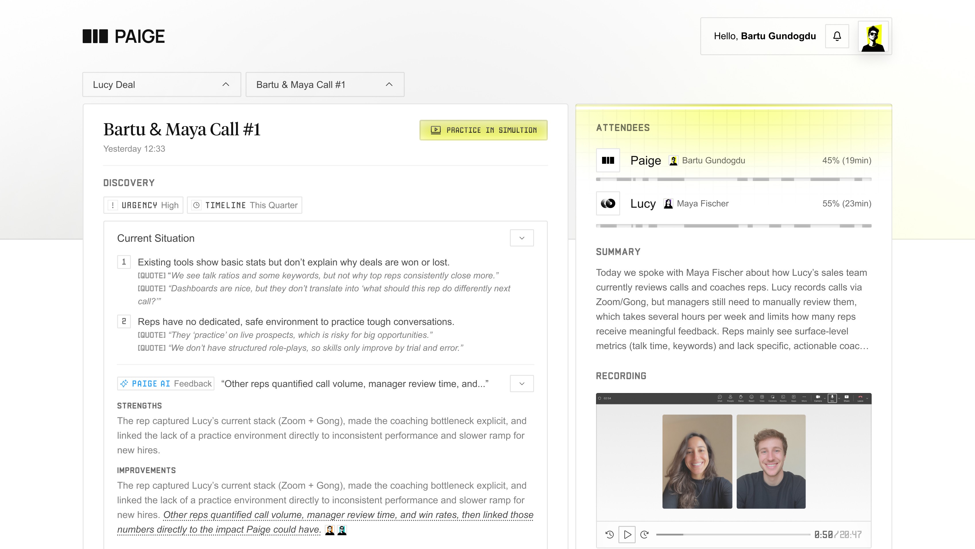 Paige turns your real sales calls into realistic role-plays. Because it learns from your actual buyer questions, objections, and tone, every simulation feels like a real conversation, so reps can practice the moments that actually decide deals.