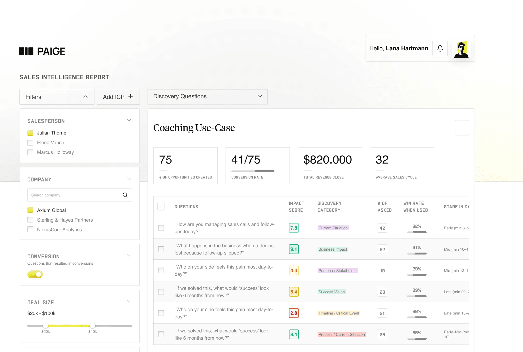 Paige analyzes your sales calls, identifies what's winning by ICP, gives post-call coaching to your reps, and builds AI roleplays that keep your sales playbook sharp.