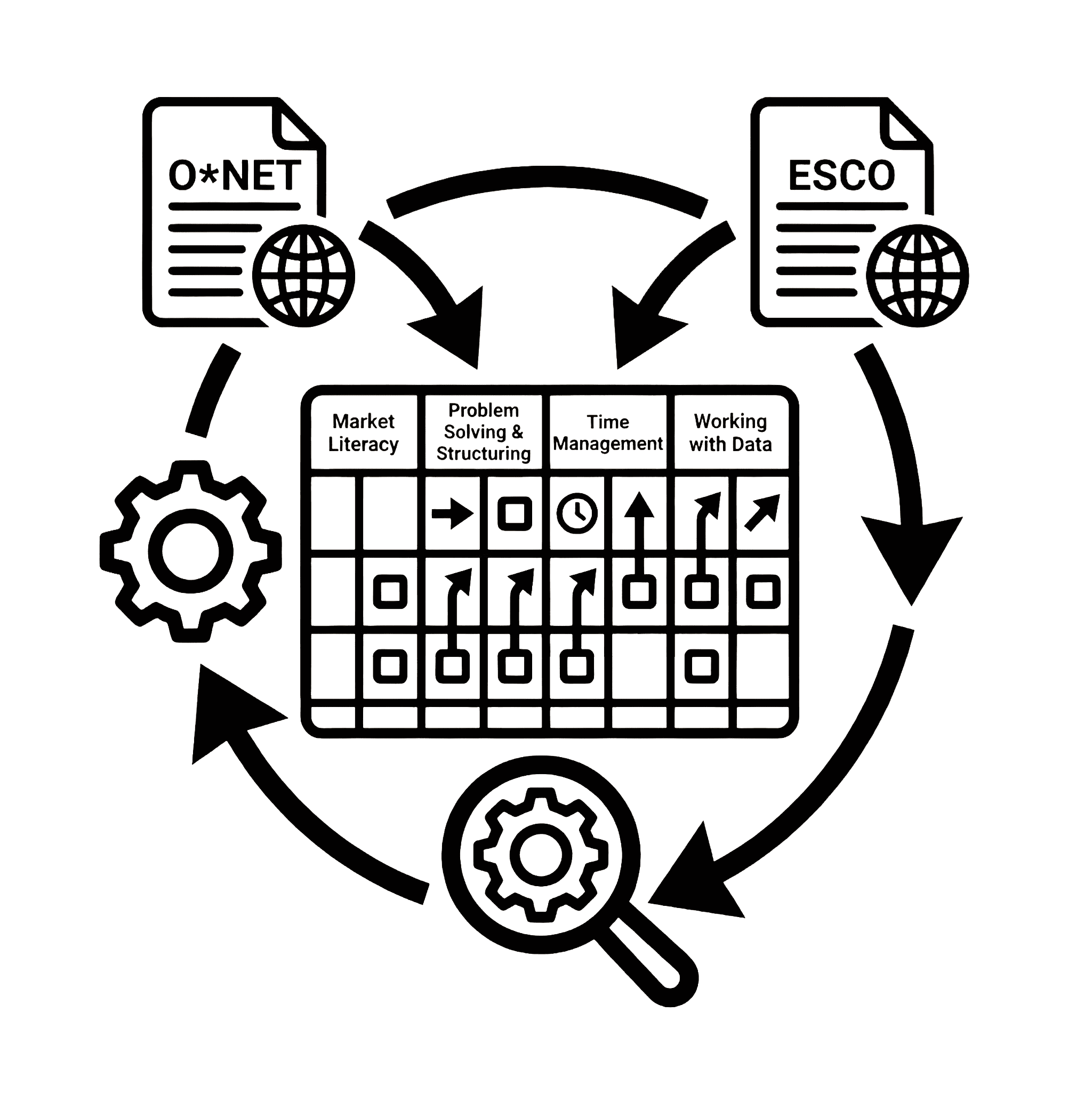 To design our skill-matrix, we start from two well-established frameworks: the US Department of Labor’s O*NET database and the European Commission’s ESCO classification. Using these as a foundation, we identify the competencies that matter most in the roles we are doing case-studies.